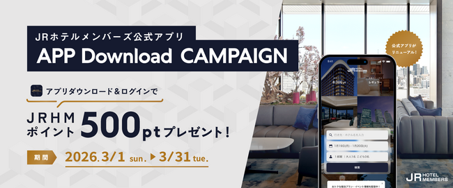 北海道から沖縄、台湾まで、個性豊かな135施設のホテル・旅館が集うJRホテルグループの会員プログラム「JRホテルメンバーズ」では、2026年3月1日(日)~3月31日(火)までの期間、会員向けスマートフォンアプリ「JRホテルメンバーズ 公式アプリ」のダウンロードキャンペーンを実施いたします。