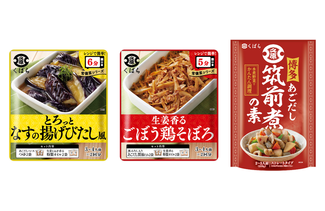久原本家グループ(福岡県糟屋郡久山町、社主:河邉哲司)は、あご(トビウオ)のだしのうまみを生かした調味料を販売する株式会社久原醤油から、2026年3月1日(日)より、電子レンジで簡単に本格的な副菜を作ることのできる新シリーズ「常備菜シリーズ」を発売します。シリーズ第1弾は『とろっとなすの揚げびたし風』『生姜香るごぼう鶏そぼろ』の2品。また、水煮野菜を活用して調理時間を大幅に短縮する『筑前煮の素』も同日に販売いたします。