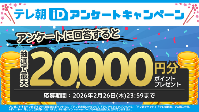 株式会社テレビ朝日(以下、テレビ朝日)は、テレビ朝日グループ共通ID「テレ朝iD」をお持ちの方を対象に、「テレ朝iDアンケートキャンペーン」を2026年2月20日(金)12:00より開催中です。アンケートにご回答いただいた方の中から抽選で5,555名様に、テレ朝ポイント(期間限定ポイント)を最大20,000ポイントプレゼントします。さらに「テレ朝リンク」を設定して回答すると、5,000ポイントが当たる「テレ朝リンク賞」にも応募可能です。