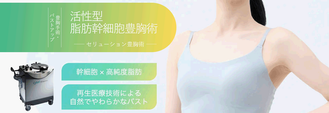 セリューション豊胸術とは、患者様ご自身の脂肪を採取し、その中から脂肪由来幹細胞を抽出・濃縮して脂肪とともに注入することで、脂肪の定着率向上と自然な仕上がりを目指す脂肪注入豊胸術です。