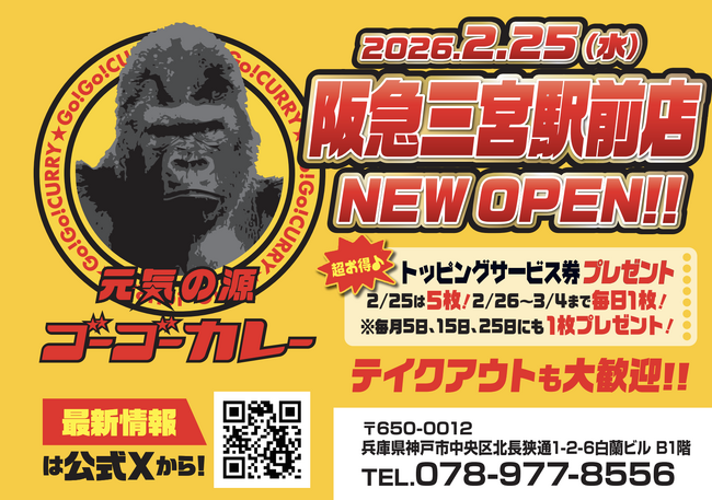株式会社ゴーゴーカレーグループ(本社:石川県金沢市、代表取締役:西畑誠、以下 ゴーゴーカレー)は、2026年2月25日(水)にゴーゴーカレー阪急三宮駅前店をオープンいたします。