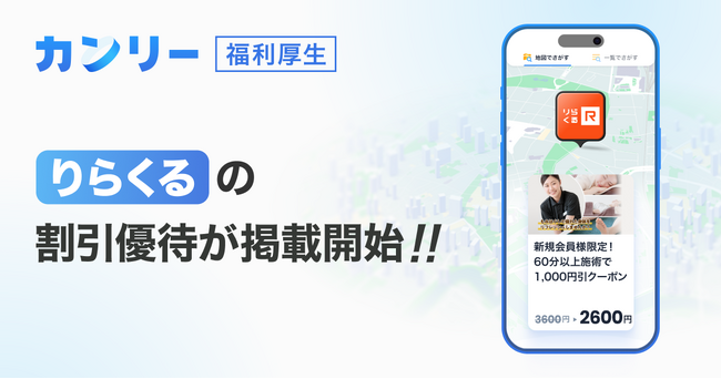 株式会社カンリー(本社:東京都品川区、代表取締役:辰巳 衛 / 秋山 祐太朗)は、提供する福利厚生サービス「カンリー福利厚生」において、株式会社りらく(本社:大阪府大阪市、代表取締役社長:青木正太)が運営するリラクゼーションスペース「りらくる」の優待掲載を開始したことをお知らせいたします。