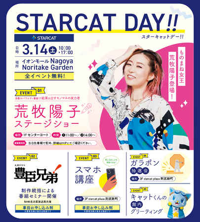 スターキャット株式会社(本社:愛知県名古屋市、代表取締役社長:横井智成、以下「スターキャット」)は、イオンモール Nagoya Noritake Garden(愛知県名古屋市)で、2026年3月14日(土)に「第7回 STARCAT DAY!!」を開催いたします。