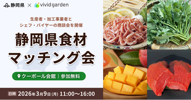 認知度・利用率など9つのNo.1(※1)を持つ日本最大の産直通販サイト(※2)「食べチョク」を運営する株式会社ビビッドガーデン(本社:東京都港区、代表取締役社長:秋元里奈)は、静岡県と連携し、2026年3月9日(月)に静岡市内で開催する「静岡県食材マッチング会」の来場者募集を開始しました。