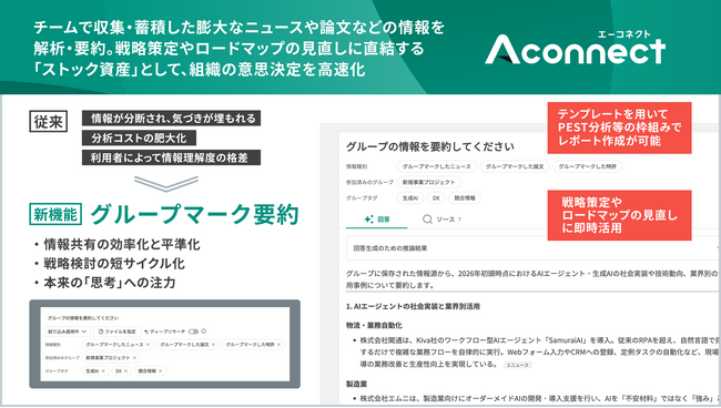 「Aconnect」の情報収集エージェントにグループマーク要約を新搭載 チームで集めた良質な情報から調査レポートの生成が可能に