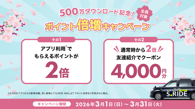 日頃のご利用への感謝を込めて、2026年3月1日(日)から3月31日(火)まで「ポイント倍増キャンペーン」を開催いたします。期間中は、アプリ配車およびS.RIDE WALLET決済でのタクシー利用で通常の2倍のS.RIDEポイントを付与するほか、友達紹介特典も通常の2倍となる4,000円分へ倍増します。