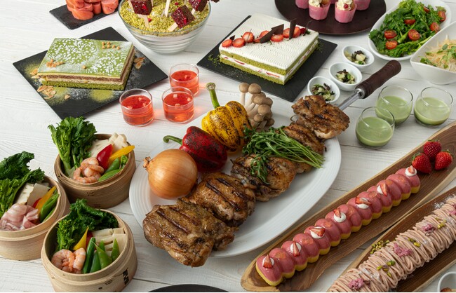 この春限定のビュッフェでは、抹茶のほろ苦さが苺の甘酸っぱさを引き立てるショートケーキをはじめ、和のエッセンスを取り入れた多彩なスイーツが約20種並びます。みずみずしい苺を、旬の時期を通して楽しめる、苺好きにはたまらないラインアップです。ライブキッチンでは、串焼きスタイルで豪快に焼き上げたチキンが登場。さらに、春キャベツや新玉葱、菜の花など旬食材を贅沢に使用した和洋のビュッフェメニューが並びます。金土日・祝日限定のディナータイムには、ボイルド蟹や牛肉の鉄板焼きなど、週末を華やかに彩る特別メニューもご用意。ご家族やご友人、大切な方とのひとときを、彩り豊かな料理とともに、心躍る春の味わいでお楽しみください。