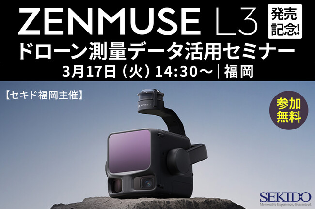 DJI(ディージェイアイ)正規販売代理店としてドローンの導入・運用支援を行う株式会社セキド(本社:東京都港区、代表取締役:大下貴之)は、セキド福岡(運営:株式会社レイメイセキド)主催にて、2026年3月17日(火)に福岡県福岡市で無料セミナー「『DJI ZENMUSE L3』発売記念!ドローン測量データ活用セミナー in 福岡」を開催いたします。