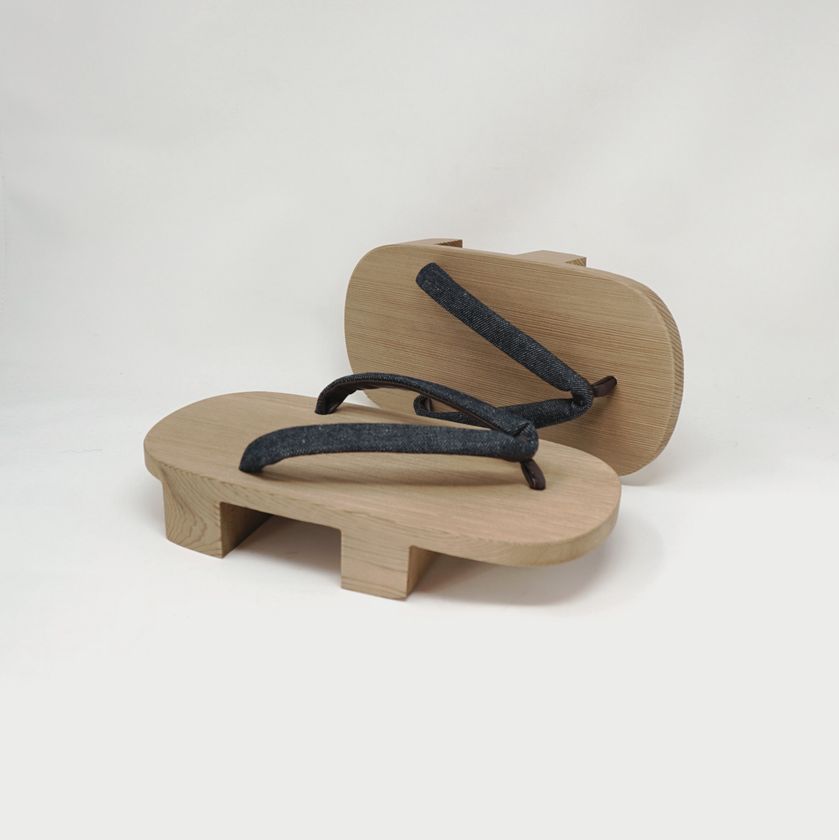 本作は、木曽の神秘的な「ねずこ」が持つ、丈夫さと高い反響性を軸に製作しています。路地やいつもの散歩道に、カランと澄んで響く足音。その音は、愛犬を連れて歩くような日常の景色に溶け込みながら、履く人の感覚を心地よく揺り動かします。深く静かな「インディゴ染」、そして木肌の美しさが際立つ「無垢」。それぞれの佇まいが、街を奏でる音色に彩りを添えます。