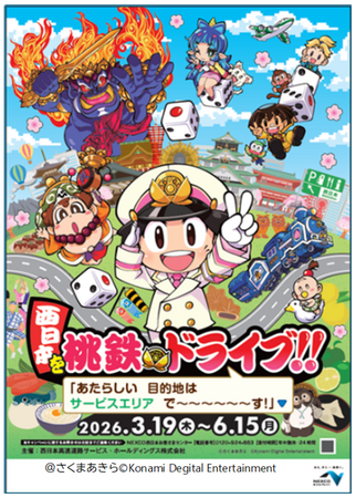 令和8年3月19日(木曜)から6月15日(月曜)まで高速道路のSA・PAで大人気すごろくゲーム「桃太郎電鉄」(発売元:株式会社コナミデジタルエンタテインメント)とのコラボイベント「西日本を桃鉄ドライブ!!」を開催します。