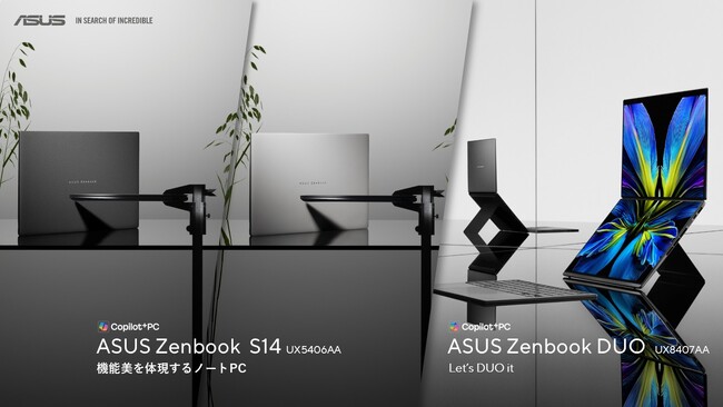 ASUS JAPAN株式会社は、最新のインテル(R) Core(TM) Ultra X9 プロセッサー 388Hと2つの14型有機ELディスプレイを搭載し、デュアルスクリーンモードやデスクトップモードなど、様々なモードで使用できる、革新的なデュアルディスプレイノートPCの「ASUS Zenbook DUO UX8407AA」と、インテル(R) Core(TM) Ultra 9 プロセッサー 386Hを搭載した薄型軽量スタイリッシュな14型ノートPC「ASUS Zenbook S14 UX5406AA」の2製品計3モデルも発表いたしました。「ASUS Zenbook DUO UX407AA」は3月下旬以降発売を予定し、「ASUS Zenbook S14 UX5406AA」は2月26日(木)より予約開始し、3月18日(水)発売予定となります。