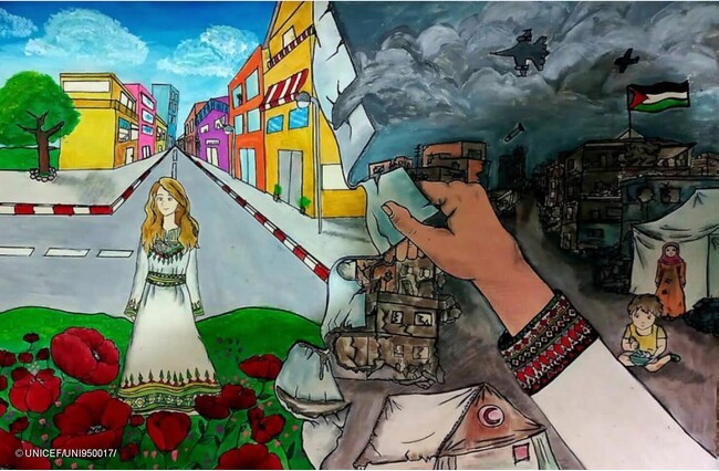 ガザの子どもたちが「私たちが望むガザ(The Gaza We Want)」イニシアティブの一環として描いた一枚の絵 (パレスチナ、2026年2月24日撮影) (C) UNICEF/UNI950017/