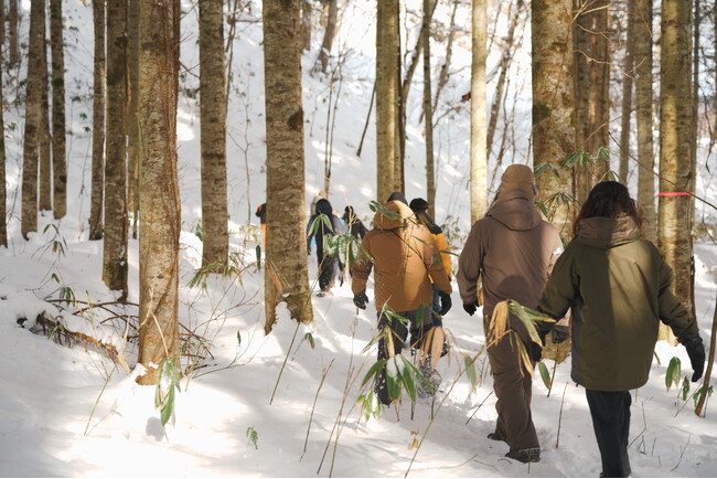 2日目、一行はスノーシューを履き、現役の猟師と自然活動家と共に冬の山へ。静寂に包まれた森の中で、「彼らの気配」を五感で探しました。