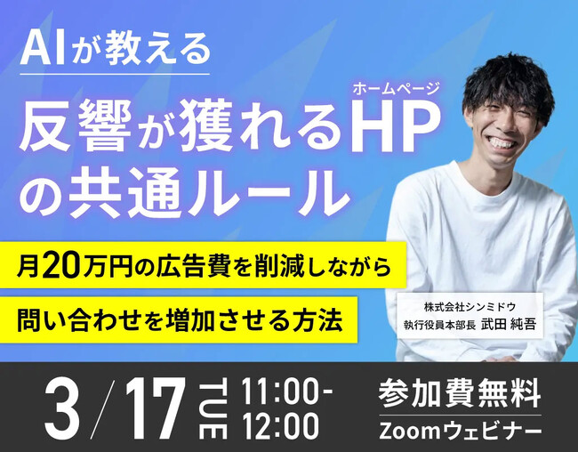 株式会社シンミドウ(本社:埼玉県さいたま市、代表取締役:笹田知弘)は、2026年3月17日(火)に、『AIが教える『反響が獲れるHP』の共通ルール』を開催します。