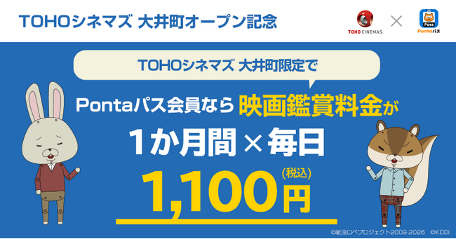 KDDIは約1,500万人が利用しているおトクなサブスクリプションサービス「Pontaパス」(月額548円)会員の特典として、「TOHOシネマズ」の新劇場となる「TOHOシネマズ 大井町」のオープンを記念し、2026年3月28日から4月27日までの1カ月間、「TOHOシネマズ 大井町」での鑑賞料金が連日1,100円(「auマンデイ」適用価格、一般・大学生の場合)となる「Pontaパス×TOHOシネマズ 大井町オープン記念キャンペーン」を実施します。「auマンデイ」は、通常は毎週月曜日限定の特典ですが、期間中は土日祝日を含め毎日ご利用いただけます。