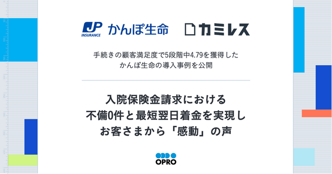 株式会社オプロ(本社:東京都中央区、代表取締役社長:里見 一典、以下「オプロ」)は、株式会社かんぽ生命保険(本社:東京都千代田区、取締役兼代表執行役社長:谷垣邦夫、以下「かんぽ生命」)における、入院保険金請求手続きのCX向上および業務効率化の事例記事を公開したことをお知らせします。