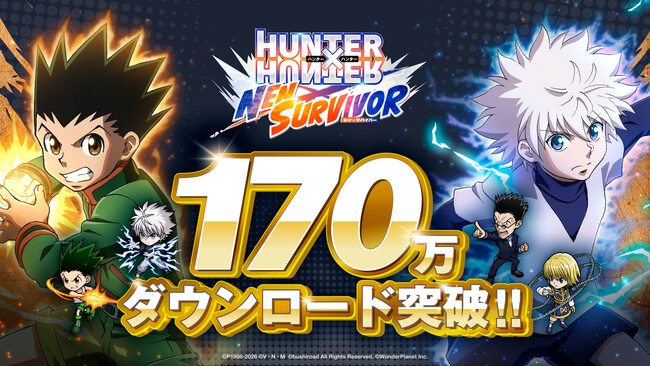 株式会社ブシロード(本社:東京都中野区、代表取締役社長:木谷高明)とワンダープラネット株式会社(本社:愛知県名古屋市、代表取締役社長CEO:常川友樹)は、両社による共同開発の新作モバイルゲーム『HUNTER×HUNTER NEN×SURVIVOR』が世界累計170万ダウンロードを突破したことをお知らせいたします。