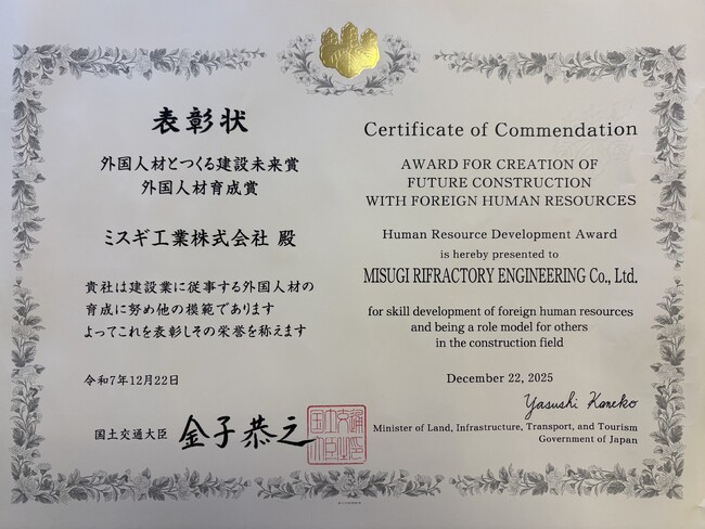 当社は昨年末、国土交通省が所管する外国人材とつくる建設未来賞において「外国人材育成賞」を岡山県初の企業として受賞いたしました。本賞は、建設分野における外国人材の育成および定着支援において顕著な成果を上げた企業・団体を表彰するものです。