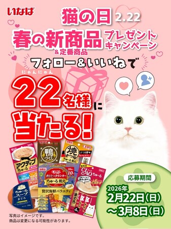 いなばペットフード株式会社(いなば食品グループ 本社:静岡県静岡市清水区由比)は、2026年2月22日の「猫の日」を記念し、Instagramでプレゼントキャンペーンを開催しております。公式アカウントのフォロー&「いいね」で22名様に春の新商品&定番商品セットが当たります。