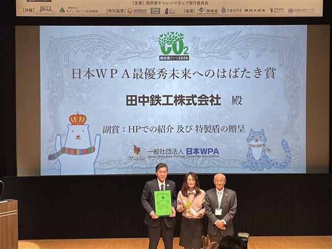 アスファルトプラントメーカー 田中鉄工株式会社(本社:佐賀県、代表取締役CEO:村田 満和)は、2026年2月20日(金)、日本科学未来館で開催された「脱炭素チャレンジカップ2026(一般社団法人地球温暖化防止全国ネット主催)」において、「日本WPA最優秀未来へのはばたき賞」を受賞しました。