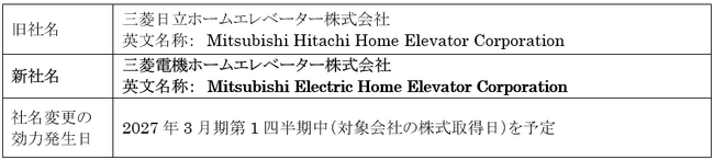 本社所在地、事業内容、主な拠点等は原則として変更ありません。社名変更は、三菱日立ホームエレベーターの株式取得と同日に効力を発生する予定です(当該株式の取得は、関係当局からの認可取得およびその他の一般的な取引条件の充足を満たしたうえで実行予定です)。