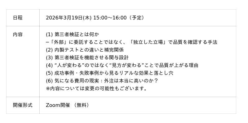 株式会社ニーズウェル(本社:東京都千代田区、代表取締役社長 松岡 元)は、2026年3月19日(木)15時より、ソフトウェア開発における品質課題の可視化と改善をテーマとした無料オンラインセミナー「テストを外注!? 『第三者検証』入門ガイド ~チェックしている“つもり”が一番危ない~」を開催します。