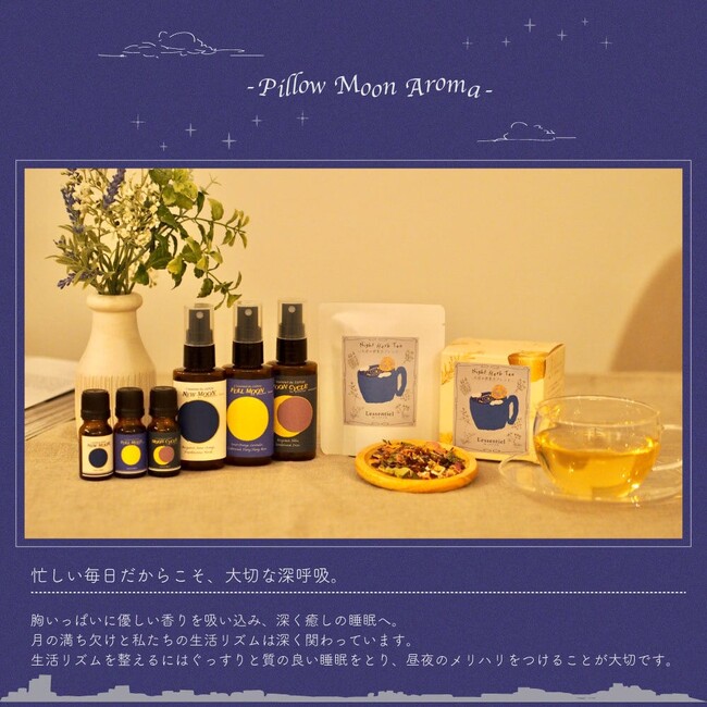 「夜が待ち遠しくなる」-ココロとカラダを月の満ち欠けにシンクロさせて。睡眠環境を整える“月のアロマ”が登場。100%天然の香りで、あなたの寝室を心地よい空間へ。