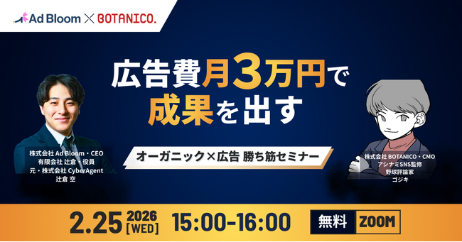 株式会社BOTANICOは、2026年2月25日(水)、オンラインにて「【2026年度版|中小企業向け】広告費月3万円で成果を出すオーガニック×広告勝ち筋セミナー」 を開催しました。