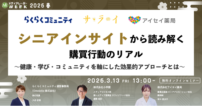 株式会社アイズ(所在地:東京都渋谷区、代表取締役社長:福島範幸、東証グロース:5242)が運営するNo.1*の広告業界のプラットフォーム「メディアレーダー」が主催するマーケティングセミナーイベント「第21回メディアレーダーWEEK 2026 春」にて、シニア向けマーケティングの専門家たちが3/13(金)に登壇します。視聴申し込みは無料です。