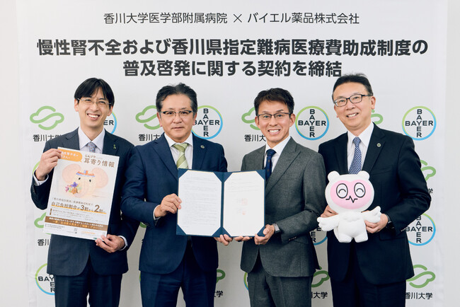 香川、大阪、2026年2月27日 ― 香川大学医学部附属病院(所在地:香川県三木町、病院長:杉元幹史)とバイエル薬品株式会社(本社:大阪市、代表取締役社長:アシュラフ・アルオウフ、以下「バイエル薬品」)は、「香川県指定難病」として県独自の医療費助成制度がある慢性腎不全について、本制度の普及啓発を通じて正しい理解と治療を促進する活動を開始しましたのでお知らせします。両者の契約の下、相互連携・協力して同県民の健康寿命延伸への寄与を目指します。