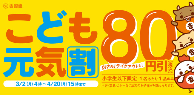 株式会社吉野家(本社:東京都中央区、代表取締役社長:成瀬哲也)は、3月2日(月)4時から4月20日(月)15時までの期間に、春休みから新学期にかけたの期間にあわせて小学生以下のお子様を対象に、丼・皿・定食・カレー・お子様メニューを税込価格から80円引きで提供する『こども元気割』を実施いたします。