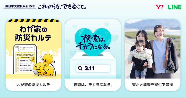 災害の記憶の継承は、発災から約30年で難しくなるともいわれています。その折り返しとなる15年の今年、新たに家族や住まいに応じた備えを診断する「わが家の防災カルテ」の提供を開始するほか、「Yahoo! JAPAN」や「LINE」で「3.11」と検索したユーザーひとりにつき10円を東日本大震災および能登半島地震・豪雨の被災地へ寄付する取り組みや、関連情報を深掘りできる「AIに聞いてみよう」コーナーなどを展開します。