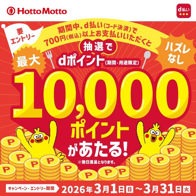 このたび「ほっともっと」では、d払いをご利用でお得にdポイント(期間・用途限定)をゲットできる、『d払い利用でほっともっとにて最大10,000ポイントがあたる!キャンペーン』を3月1日(日)より実施いたします。
