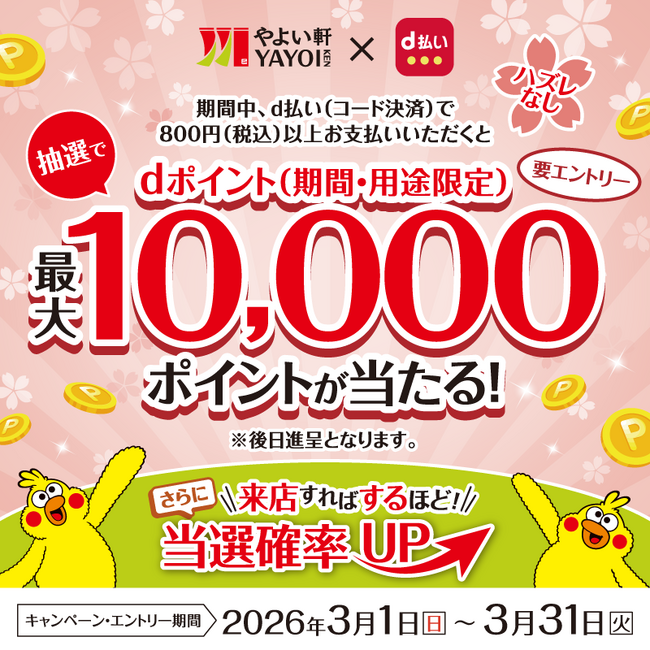このたび日本国内の「やよい軒」では、d払いをご利用でお得にdポイント(期間・用途限定)をゲットできる『d払い利用でやよい軒にて最大10,000ポイントがあたる!キャンペーン』を実施いたします。