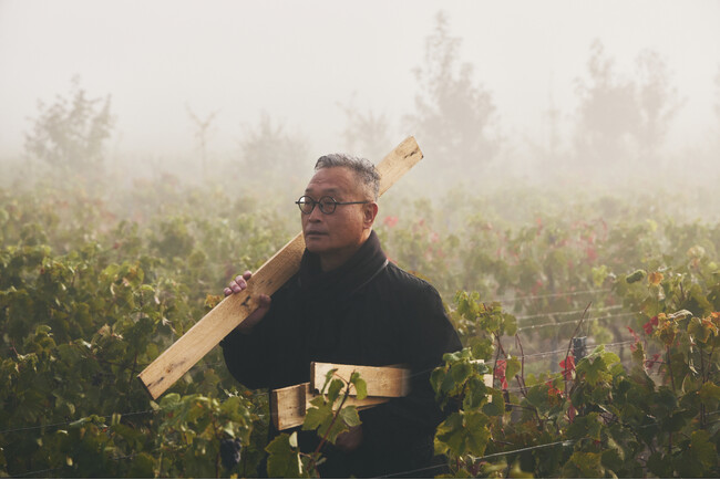 ルイナールのメゾンを訪れた際、川俣氏はメゾンと自然の要素との調和や、境界の曖昧さに感銘を受けました。朝霧がブドウ畑に漂い、太陽の最初の光が温かさをもたらし、葉を揺らすそよ風が吹く。屋外で働く人々には馴染み深いものの、普段目にすることの少ない鳥や昆虫などの動物が溢れる世界です。