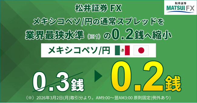 松井証券株式会社(本社:東京都千代田区、代表取締役 社長執行役員:和里田 聰、以下「当社」)は、2026年3月2日(月)取引分より、FX(外国為替証拠金取引)サービスにおいて、メキシコペソ/円の通常スプレッドを0.3銭から業界最狭水準(※1)の0.2銭に縮小いたします。また、メキシコペソ/円を含む高金利通貨ペアを対象としたキャッシュバックキャンペーンを、同日3月2日(月)より開催いたします。