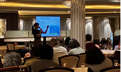 これは、山梨県産ワインの認知拡大およびブランディング強化を目的としており、日本ワインの先駆者として世界的な評価を受ける中央葡萄酒株式会社(山梨県甲州市)の三澤彩奈氏をお招きした特別講演会を開催、ディナー時には船内メインダイニングにて同社の山梨県産厳選ワインをオンメニューし多数のお客さまが楽しまれました。