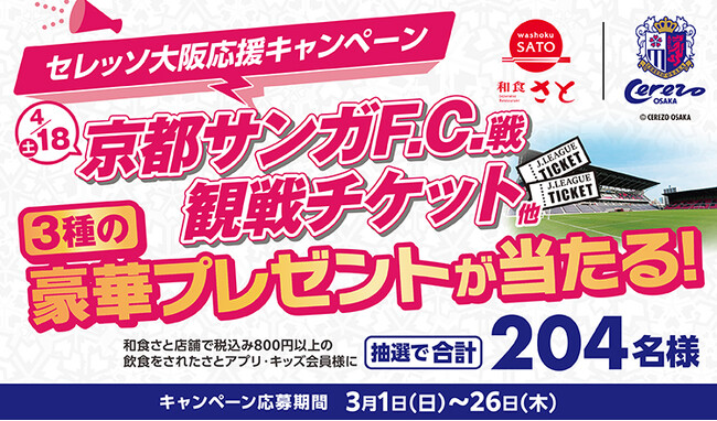 国内201店舗を展開する「和食さと」は、創業地である大阪を代表するプロサッカークラブ「セレッソ大阪」を、ゴールドパートナー企業として応援しております。このたび、セレッソ大阪応援キャンペーンの一環として、抽選で各賞合計204名に当たる豪華プレゼントキャンペーンを開催します。今回は「観戦コース」または「グッズコース」の各コースを選んで応募いただけます。【観戦コース】では[金賞]として、4月18日(土)開催の京都サンガF.C.戦をホームバック南B指定席で観戦できるペアチケットを50組100名様にプレゼント!さらに和食さとの人気商品「食べ放題」をお召し上がりになり応募時にレシートを添付すると、[特賞] のホームメイン北指定SSで観戦できるペアチケット(2組4名様対象)への応募チャンスも!また、【グッズコース】では、和食さと×セレッソ大阪オリジナルタオルマフラーをプレゼントいたします。キャンペーンはさとアプリ会員またはさとキッズくらぶ会員様が対象です。会員ご登録のうえ、専用の応募フォームから必要事項を入力いただきご応募をお願いします。また、応募にはお客様情報の入力と、応募期間中に和食さと店舗でご飲食頂いたレシート番号(税込800円以上のレシート)が必要です。