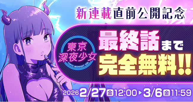 株式会社Cygames(本社:東京都渋谷区、代表取締役社長:渡邊耕一)は、マンガ配信サービス「サイコミ」で連載され、2024年11月に完結を迎えた漫画作品『東京深夜少女』について、2026年2月27日(金)12:00より期間限定で全話無料公開します。あわせて、本作の作者・もてぃま先生が作画を担当する新連載『黒衣の妹は私を許さない』の作品情報を公開しました。