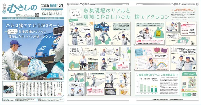 同号の特集記事は「ごみは捨ててからがスタート」をテーマに、市民に日ごろの収集活動への理解を深めてもらうため、ごみ収集員の一日をマンガ形式でわかりやすく伝え、ごみ捨てのポイントも紹介する内容。市側の広報課担当職員と協力し、当社のデザイナーが撮影にも立ち合い紙面編集しました。