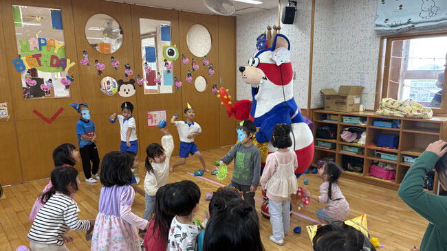 お誕生日会では「この先生は誰だクイズ」や「ゴーディークイズ」を行いました。ゴーディーが顔を隠して登場すると、すぐに「ゴーディーだ!」と気づく子どもたちの元気な声が響き渡り、大盛り上がりのひとときとなりました。