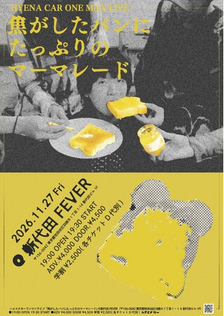元ヘンリーヘンリーズのボーカリスト、村瀬湊(むらせみなと)によるソロプロジェクト、ハイエナカーが新代田FEVERでのワンマンライブを2026年11月27日(金)に行うことが決定いたしました。イベント名は『焦がしたパンにたっぷりのマーマレード』となっており、サポートメンバーとして長島 アキト(Ba./町田直隆BAND、ex本棚のモヨコ)、白井岬(Gt./新井清弥)、楠蓮(Dr./BOND LOST ACT)、さらにリズムギターとしてシンガーソングライターのスズキケントが参加した5人編成でのライブとなります。