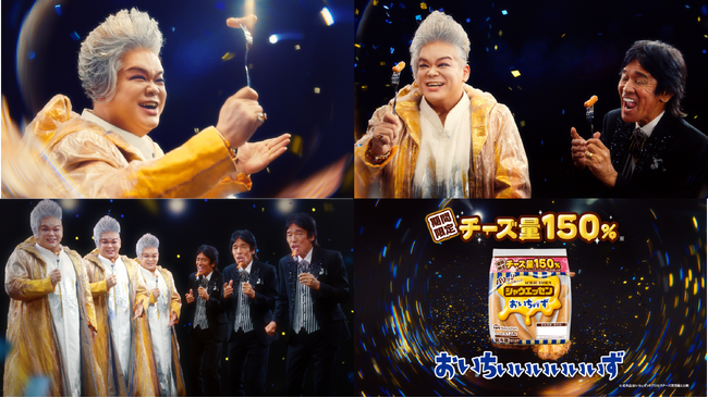 3本目のCMでは、チーズ量150%※、そして6種の濃厚チーズを表現し、岡本知高さんと松崎しげるさんがまさかの6人に進化して”六重唱”を披露。岡本さんが肩を叩かれ振り向くと、そこにはもう2人の岡本さんが登場。続いて松崎さんも肩を叩かれると、さらに2人の松崎さんが現れ、2人が6人へと増え、6人で呼吸を合わせた瞬間、魅惑の合唱がスタート。岡本さんのオペラティックなロングトーンに、松崎さんの情熱的なシャウトが重なり、6人で織りなす魅惑のハーモニーで濃厚チーズのよろこびを全身で表現します。「おいちぃぃぃぃぃぃず♪」の余韻をしっかり印象づけ、歌い終わった後の静かな余韻の中で、『おいちぃぃぃぃぃぃず』をパリッ!!と食べる6人の幸せな表情でCMは終わります。ステレオサウンドを活かし、6人の声が左右から立体的に聞こえる演出で、その場で合唱を聴いているような臨場感です(イヤフォン推奨)。[画像4: https://prcdn.freetls.fastly.net/release_image/144818/15/144818-15-76aec64f80237b93c4afa55a7ca08c4f-2359x886.png?width=536&quality=85%2C75&format=jpeg&auto=webp&fit=bounds&bg-color=fff ]