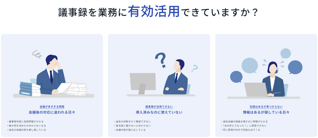 多くの企業では、会議後の議事録作成に時間がかかるだけでなく、作成した議事録が実際の業務に活かされていないという現実があります。「あの件どうなった?」「誰がいつ何を決めたのか分からない」「担当者に聞かなければならない」--こうした非効率が、現場担当者の生産性を日々損なっています。 特に、過去の議事録や会議内容が特定の担当者の記憶や個人フォルダに属人化しやすく、異動・退職時の引継ぎや、新人の業務習得において大きなボトルネックとなっていました。