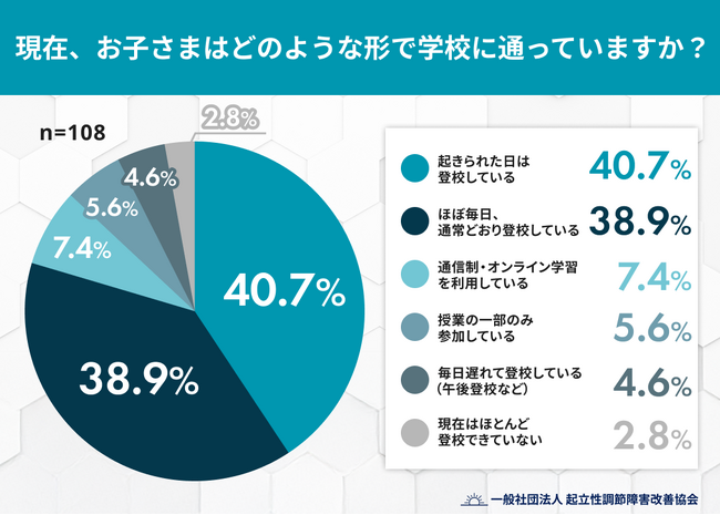 朝の強い倦怠感や立ちくらみを特徴とする起立性調節障害(OD)は、本人の努力だけではコントロールできない身体的な疾患です。しかし、学校現場では依然として「毎日決まった時間に通うこと」が標準とされ、それができないことへの罪悪感や焦燥感に苦しむ親子が少なくありません。新年度という大きな転換期を前に、今の子どもたちが実際にどのような形で学校と関わっているのか、その「リアルな距離感」を可視化することで、一つの正解に縛られない新しい登校のあり方を提示したいと考え、本調査を実施しました。調査サマリー