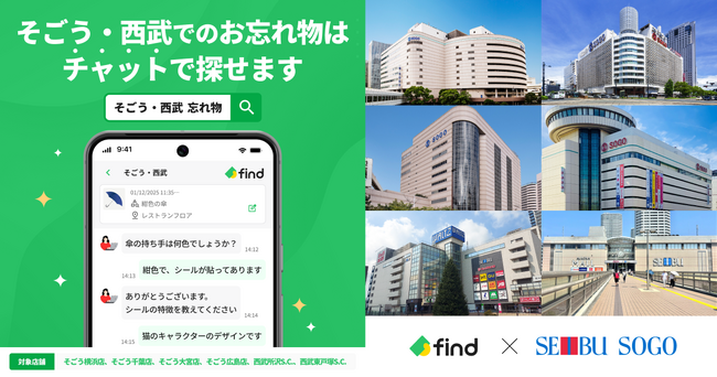 株式会社find(本社:東京都港区、代表取締役CEO:高島 彬、以下「find」)が提供する「落とし物クラウ ドfind」を株式会社そごう・西武(本社:東京都豊島区、取締役 執行役員社長:田口 広人、以下「そごう・西武」)へ導入します。