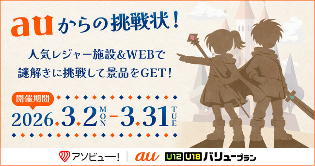 休日の便利でお得な遊び予約サイト「アソビュー!」(URL:https://www.asoview.com/、以下「アソビュー!」)を運営するアソビュー株式会社(所在地:東京都品川区、代表取締役:山野 智久、以下「当社」)は、KDDI株式会社(以下「KDDI」)と協力し、2026年3月2日(月)より、全国5箇所の人気レジャー施設にて、期間限定の謎解きイベント「auからの挑戦状!ヒミツの言葉を解き明かし、英雄になろう!」を開催いたします。