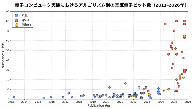 本図は、量子コンピュータ実機において実証された量子ビット数の拡大を示しています。近年は、ハードウェア性能の向上に加え、アルゴリズムの高度化が実機で扱える問題規模を大きく押し上げています。特にQSCIは、従来手法と比較してより大規模な問題を実機上で実証しており、量子コンピューティングの実用領域拡大を牽引するアプローチであることがわかります。