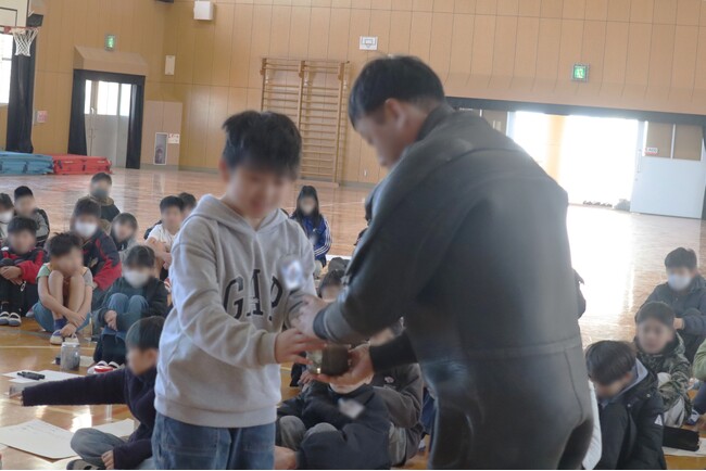 育てたアマモポットを当社の協力会社のダイバーへ受け渡す小学生
