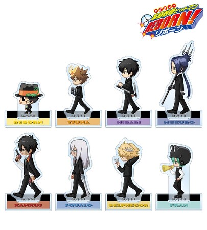 リボーン、沢田綱吉、雲雀 恭弥(10年後)、六道 骸(10年後)、XANXUS(10年後)、スペルビ・スクアーロ(10年後)、ベルフェゴール(10年後)、フランが歩いているちびキャラを新たに描き起こし、アクリルスタンドに仕上げました。